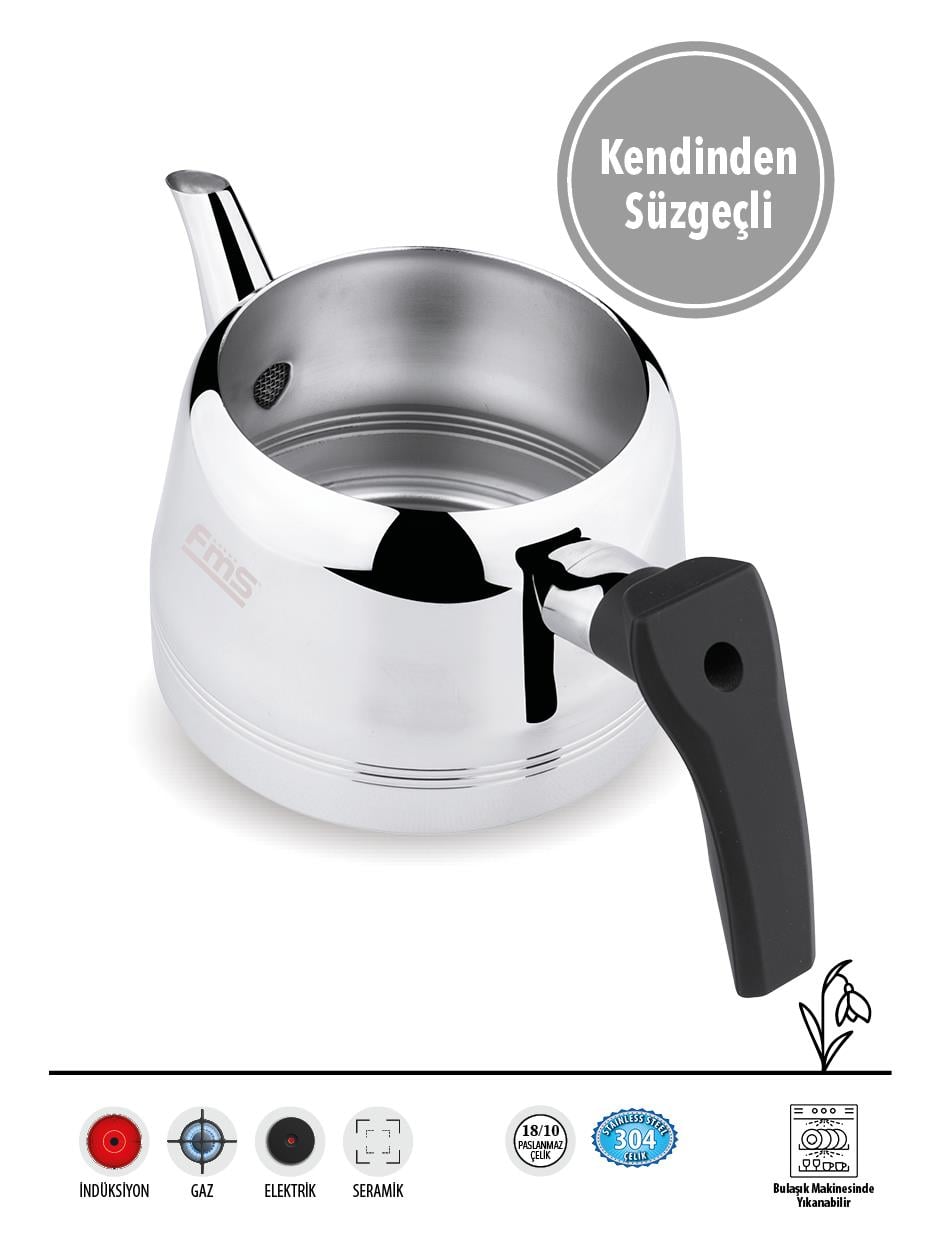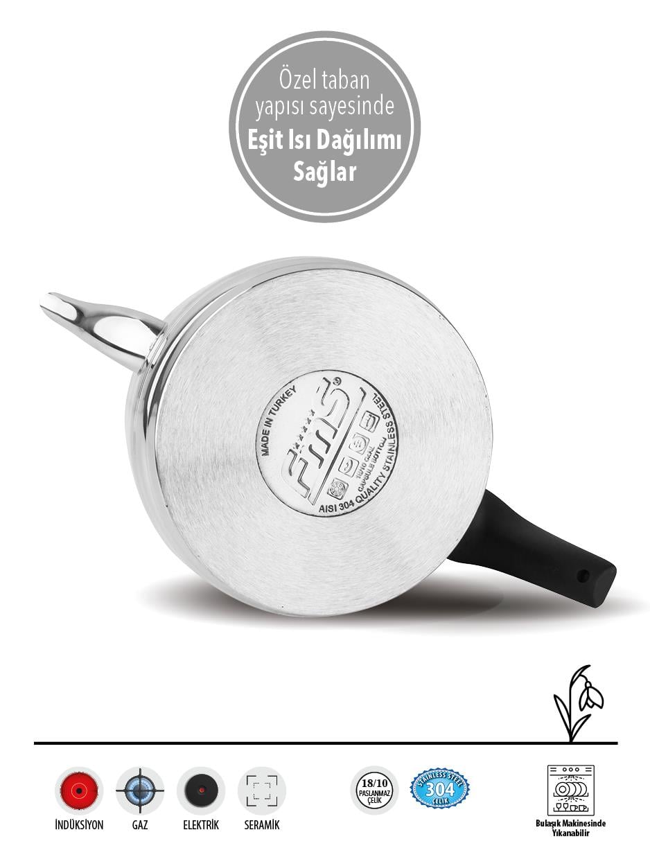 Gıda ile temas eden yüzeyleri sayesinde güvenle kullanım imkanı sunar.;Geniş hacmi, aile boyu çay keyfinizi rahatlıkla karşılar.; - Bulaşık makinesinde yıkama kolaylığı, temizlik işlemini pratik ve zahmetsiz hale getirir.; - Dayanıklı çelik materyali ile uzun ömürlü kullanım vaat eder.; - Türkiye menşeli olması, yerel üretim desteklenmesi açısından önemlidir.; - 18/10 çelik malzemesi sayesinde uzun ömürlü ve dayanıklı kullanım sunar.; Metalik renk seçeneğiyle modern ve şık bir görünüm kazandırır.; - Tek ebat tasarımı, kolay saklama ve taşıma imkanı sağlar.; - Bulaşık makinesinde yıkama özelliği ile pratik temizlik avantajı sunar.; - TR menşei garantisiyle yerli üretim kalitesini evinizde yaşatır.;  Ergonomik sap tasarımı, güvenli ve rahat kullanım için optimize edilmiştir.; - İndüksiyon tabanlı yapısı sayesinde farklı ocak türleriyle uyumlu pişirme deneyimi yaşatır.