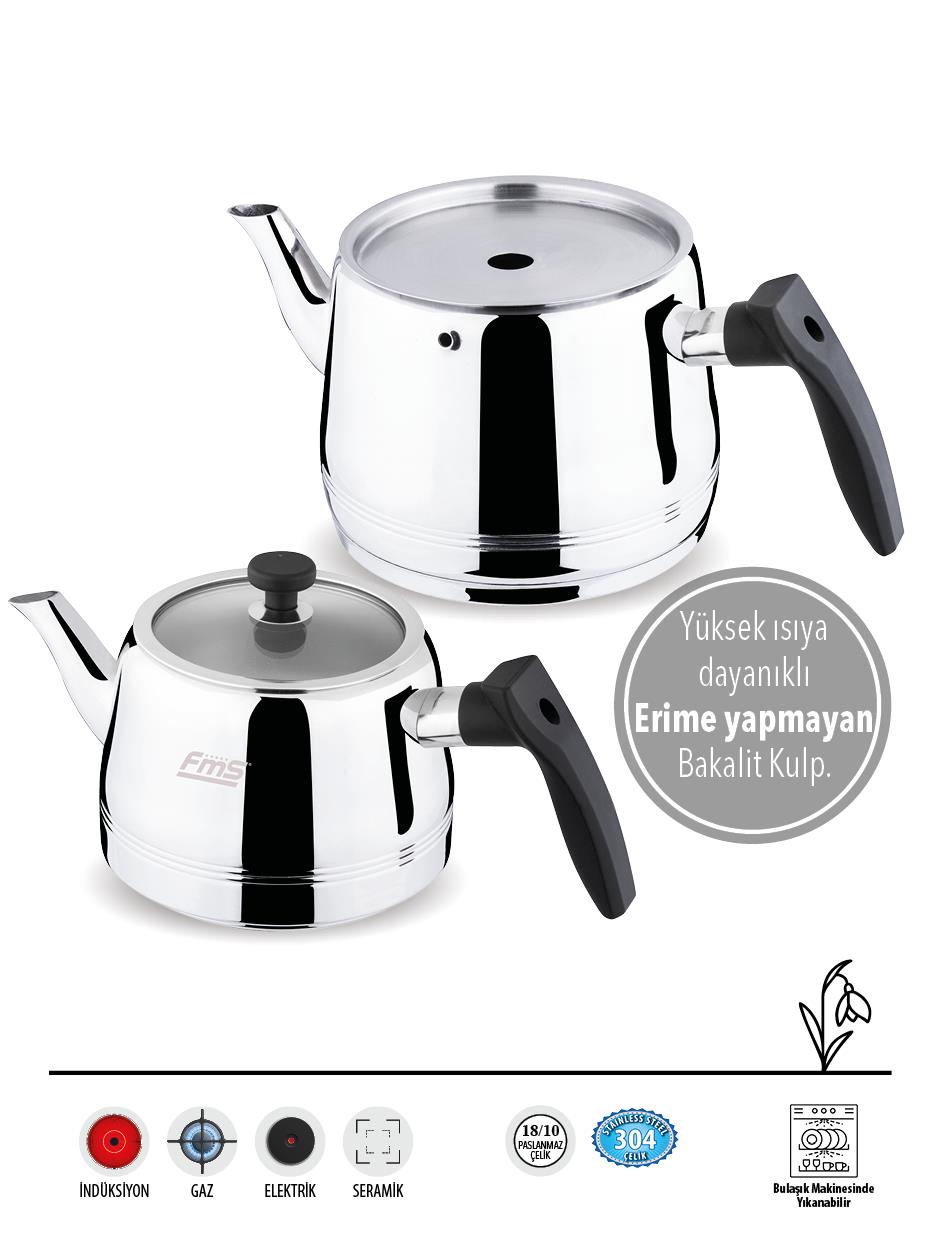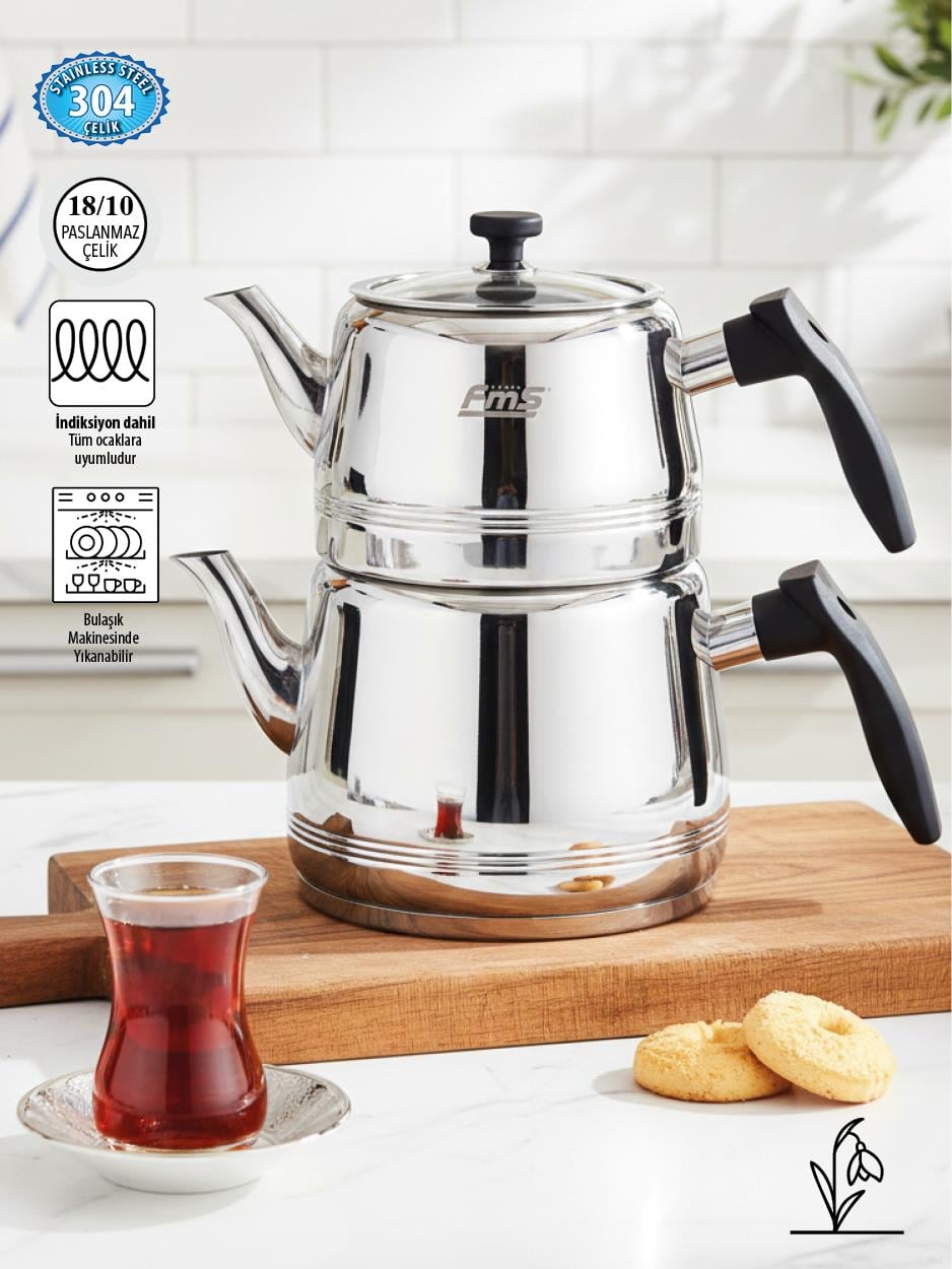 Fms Burcu | Orta Boy | Siyah | 18/10 Çelik Çaydanlık | İndüksiyon Taban | Ergonomik Sap | 1,25 L+ 2 L (4029SYH)